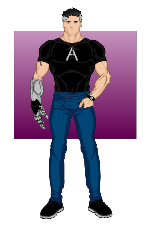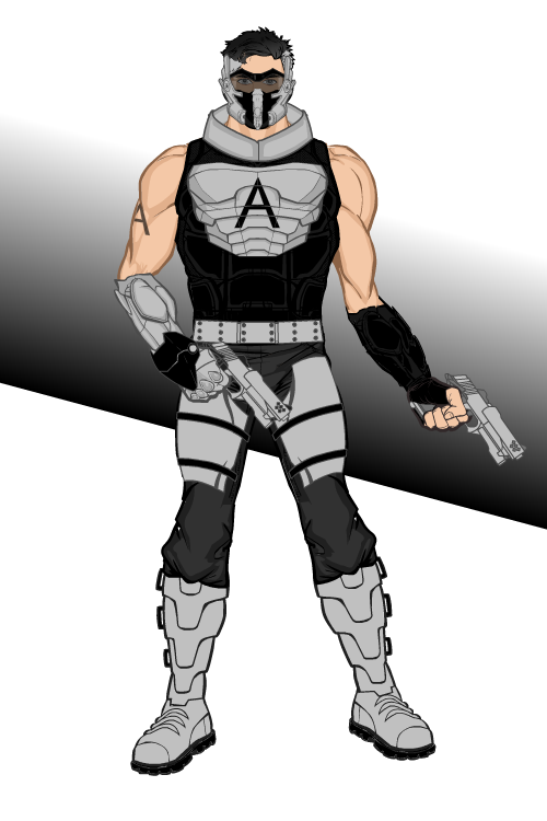 Here is Alpha, AKA Alex Patten, one of the premier heroes of my universe. He has enhanced strength, reflexes, speed, senses, a healing factor, and the ability to scan weapons which allows him to intuitively know how to use them and to replicate them using magical energy. This allows him to summon weapons and be a one man army. He favors pistols and has a repertoire of trick bullets.