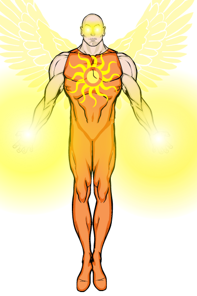 Acolyte has a variety of powers including flight, light energy protection, healing and teleportation, but his power vary depending on exposure to the sun, so at midday his power are virtually limitless but at night they are a lot weaker, this thought to be because his super-human cell generate his power through a process similar to photosynthesis. His received his powers during his day job as a geologist, he was underground examining crystal formations, when he came across a strange glowing crystal. As he touched it energy surged through his body and he was sent flying 10 meters through the air. He woke up 2 weeks later, in hospital, having been in a coma. A few later he discovered hi power, when his wife was killed by an armed criminal, in his rage his body erupted with light and the criminal was incinerated. He went into hiding, but after the incident the legendary legion where looking for him thinking he was a villain. But when they discovered his true nature they offered him a place on the team which he accepted.