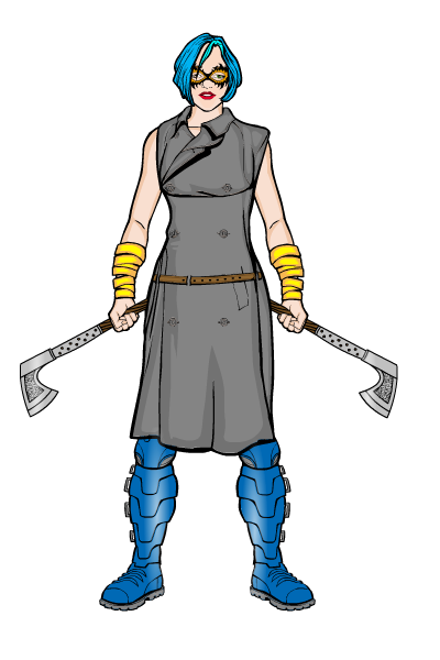 Wolf MasterParticipantJessica Porter was not the best at fitting in. It might wasn’t that she was anti-social or anything. Its more that she was intimidating to most her classmates, not on purpose though. But it didn’t that on the first day of secondary school, she beat-up the captain of the rugby team, leaving him with a broken nose and 2 fractured ribs. Most of her classmates where scared of girl who could take on the biggest kid in school. She was incredibly strong for a girl of her age and had a natural infinity for fighting. Though it mostly went unnoticed till the age of sixteen, when during a bank robbery she took out 3 armed criminals, one by throwing a fire axe at him and the other in hand to hand combat. Her talent was noticed by the wrong people and she became part of a gang, who happened to be in league with a criminal telepath who was on the legendary legion’s radar. When they the team fought with the gang most of them got them sent to jail, but ape took pity on Jessica and noticing her skill he decided to train her to be a hero. She took the title the sapphire slicer, but her violent nature got the better of her and she was kicked out of team. But she found another team she fitted better with, the night watch. She utilities two axes made of a light-weight yet strong metal.