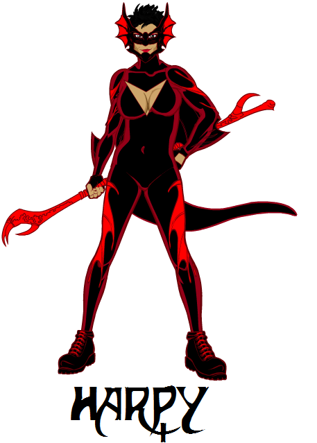 Harpy is one of the biggest thorns in the side of the Green Gremlin, but also his most frequent love interest. She was once just the daughter of a wealthy businessman, bored with life and sick of never having any challenges. She began t push herself physically,becoming a gym rat and training to compete in a number of sporting events. She put herself into peak physical condition. And then she saw the Green Gremlin in action for the first time.She was immediately enamored by the superhero, and used her father’s money to arrange “accidental meetings” a few times, but she could never really catch his eye. So Gloria created Harpy and used her new persona to get the Green Gremlin’s attention. She often commits petty crimes just so that he’ll stop her and they can spend a few minutes fighting and flirting.