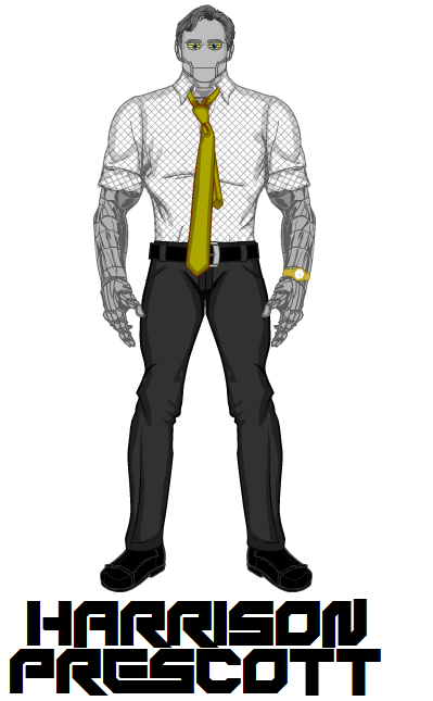 Harrison Prescott was a dashing, playboy millionaire, made so by the artificial robotic body parts he invented. Prescott was in a terrible helicopter crash, and his own product was all that could save his life. Now his entire exterior and some internal organs are robotic. He remains the cutthroat president of PresCorp, and continues making hundreds of millions of dollars each year.The U.S. government has offered Harrison several contracts for manufacturing weapons and armor for the armed forces, but he has always refused.