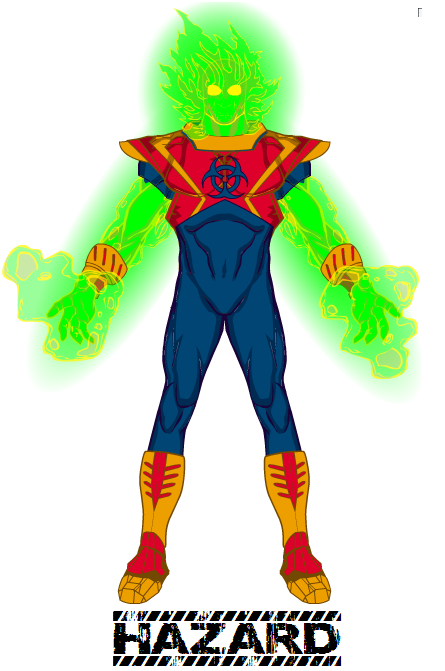 An X-13 attack on his power plant gave Oscar Daniels the super ability to absorb and then radiate blasts of nuclear energy at his enemies. He must work alone, because simply to touch his skin would make any person deathly ill with radiation poisoning. Hazard is doomed to live a life without physical contact with any other human, except the villains he fights. He secretly makes his home inside a heavy steel compartment deep within the confines of the plant. He has employed a team of geneticists with finding a cure for his powers and his cursed condition.Pictures: