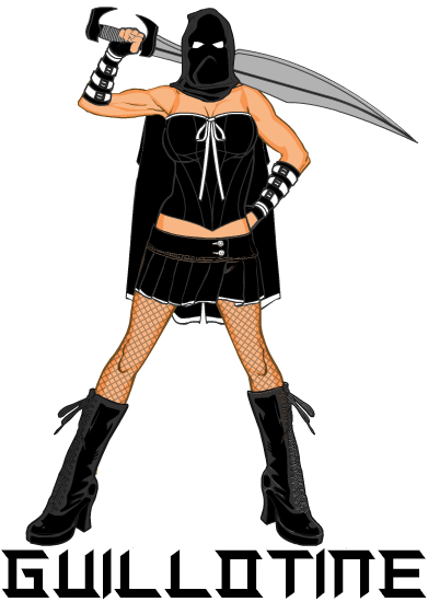 Nicolette is a psychotic French-born woman with a penchant for lopping off the heads of her enemies. She serves on the Criminal Court, a court-themed group of villains led by the malicious Prosecutor. Guillotine is known for trying to seduce her victims just before letting her long blade descend upon their necks, whispering, “Bleed for me, mon ami,” as the blade strikes. She has a scandalous crush on Defender, courageous hero and leader of the Defenders, arch-rivals of the Criminal Court.Pictures: