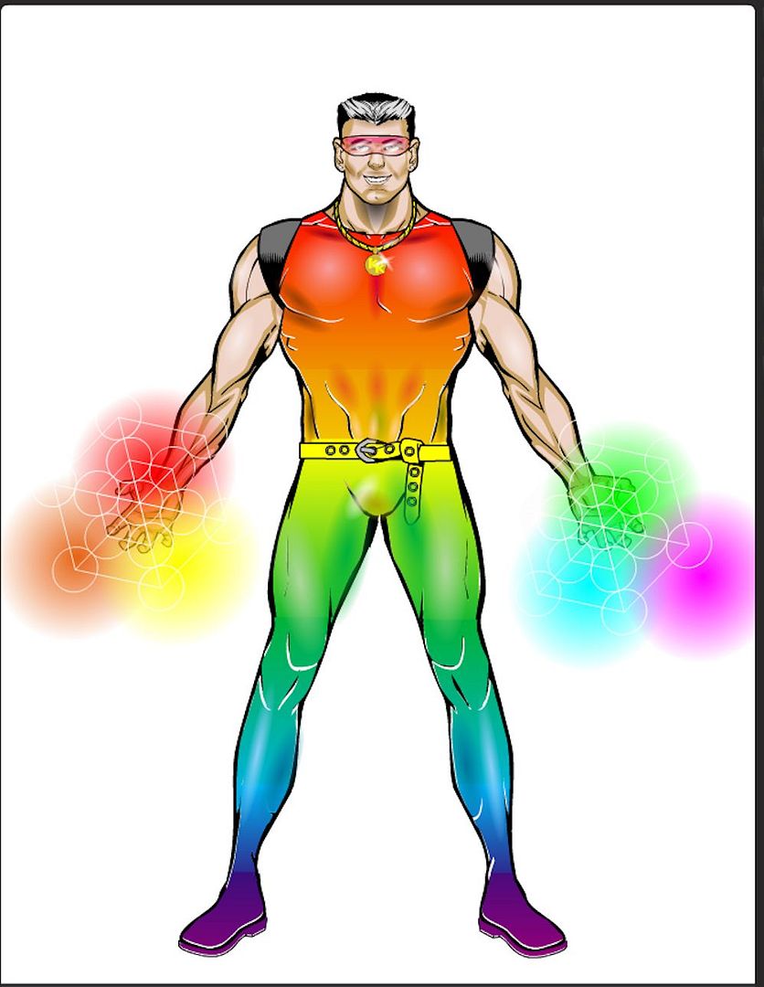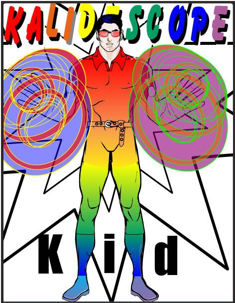 He almost immediatly became a costumed defender called Kalidascope Kid defending the local gay community from the haters, bashers, theives, muggers, gangs, drug pushers, extortinists, arsonists, embezzlers etc and even super villains..