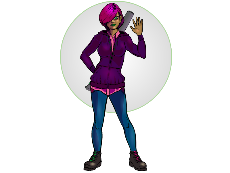 As for which of my characters for you? How about giving Sora Shade a go? She has white/light gray skin and long blue hair(here in a ponytail). Outfit is open to your interpretation.