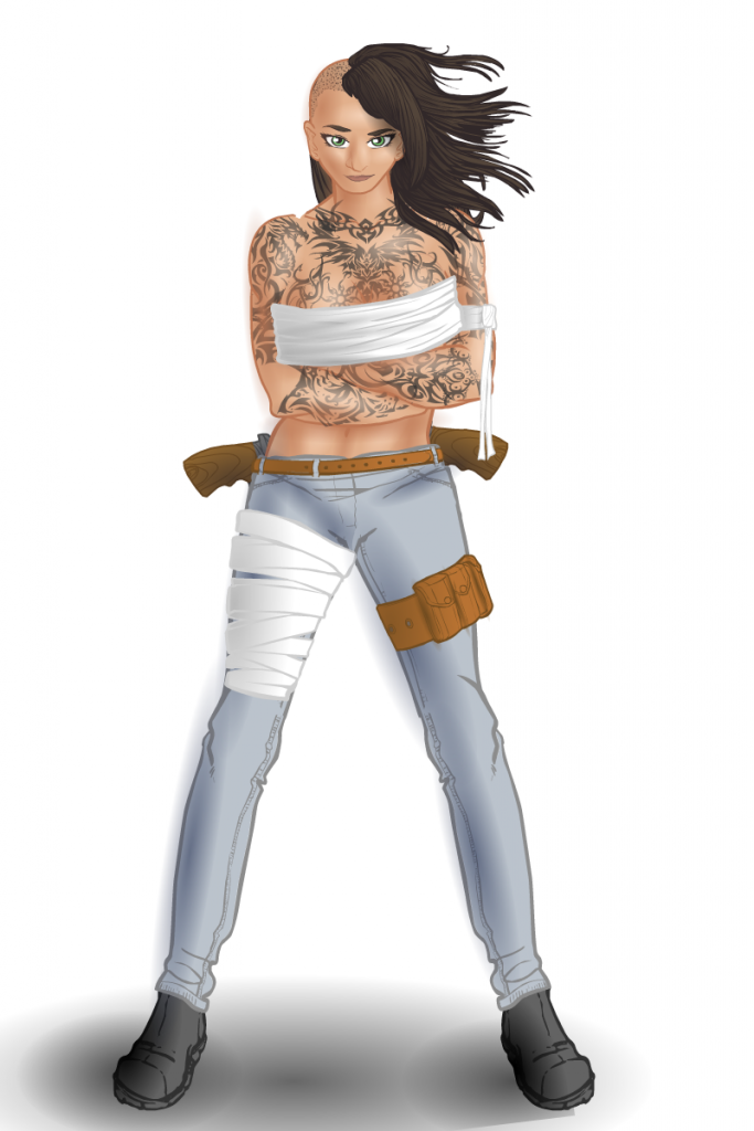 I will admit, I liked Abigaila’s previous design, but I felt like the posed picture I did of her, with her throwing a punch towards the camera, was a little out of character for her. Also, I wanted to practice shading with a dark-colored background some more 🙂