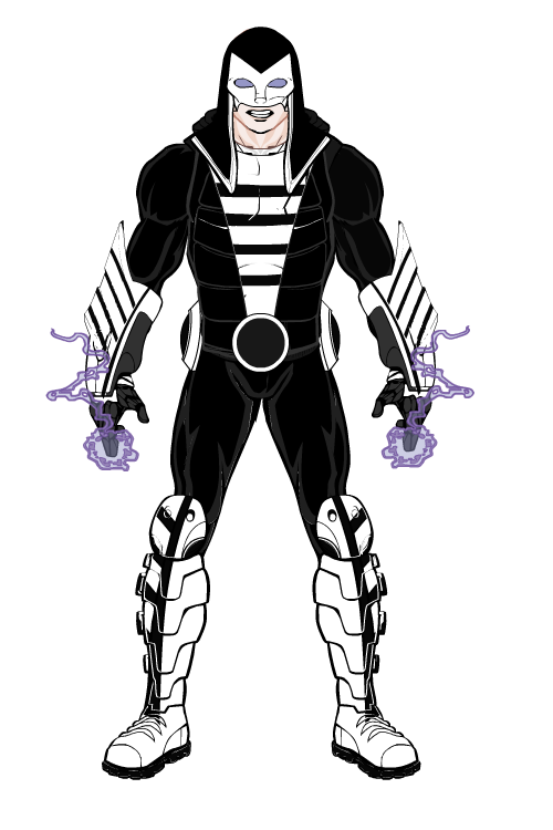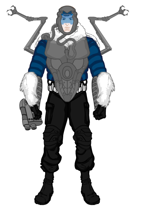 Young and arrogant, chill is a prime example of a hero corrupted by the lure of crime. A third generation superhero, Chill was born with his chest frozen over, as was his mother, and her mother. The ability has been growing stronger with each generation, with the added problem that it is more dangerous for the user. Chill requires a cold environment to remain stable, and so wears a cooling armor to both keep his frozen chest cool, and protected. Similarly, it is harder to harness, so he relies on weapons fueled by the ice within him to fight, such as hand blasters, guns and extra limbs stored within his armor. His frustration at his disability and his personal greed led him to use his ice creation and manipulation powers to lead a life of crime.