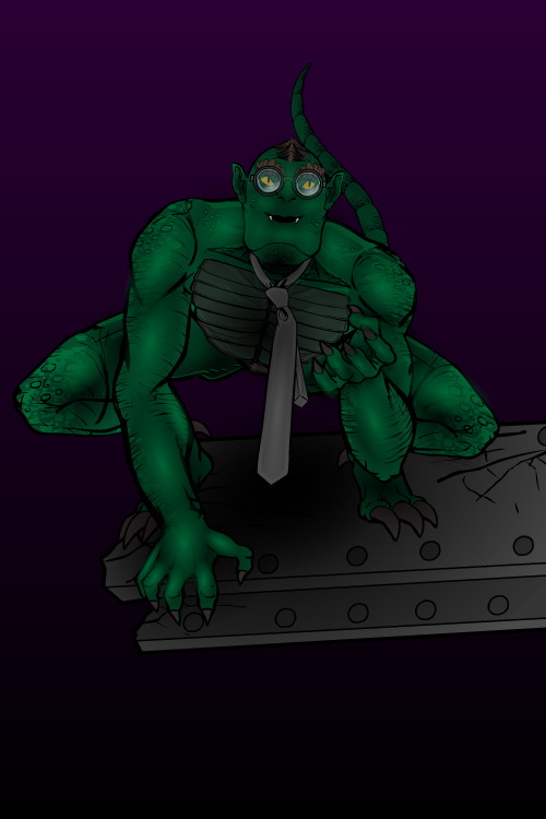 When Dewbert woke up he saw Luna staring at him, but he didn’t recognize the scenery, they appeared to be underground but how could that be? Luna explained evrything to Dewbert, and then broke the news to him. He had become lizard-like in appearance and had acquired all of the abilities that he had isolated form the various specimens. He was some sort of lizard man.