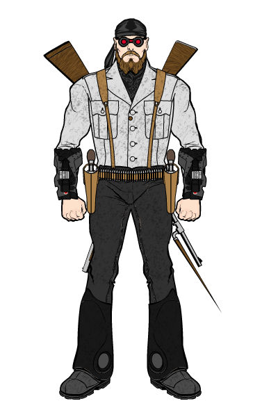 Brad, full name Bradley Lawrence, is the One Shot of the West. he gets his nick name from his infamous skill in aiming a gun, able to be quick on the draw, and the scope. said to never need to take more than one shot to down his targets, his guns are said to only hold one bullet. cursed with the power to create metal from souls, if he hits his targets right, he will be able to use their souls to make a bullet for his next target. after deciding to use his curse to help others, he roams the waste as a gun for hire. sometimes when he comes across a town in need he will stay and become a self appointed sheriff until the job is done. after hearing of his skills the western angels (a group of angels and other peace keepers headed by Wolf Pack formed to fight satan and protect the people of earth, known for being very loosely organized, fights between members are not uncommon) have been looking to try and recruit him.