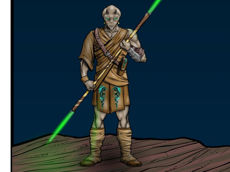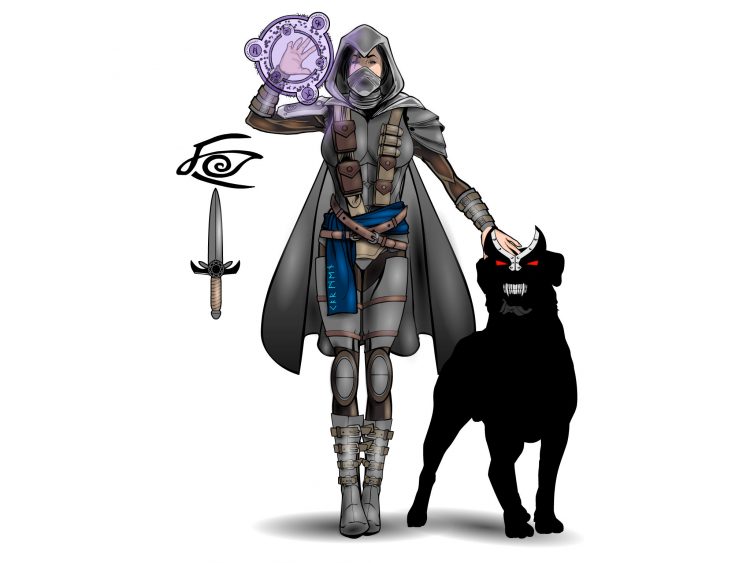 The dagger is magical in nature and will, upon command, float in the air around her to protect her while she is casting spells. The eye symbol is there to represent the magic that is controlling the dagger while it’s active. I didn’t get fancy with the dagger, because we wanted the dagger to be seen just for illustration purposes.
