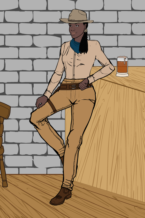 TrekkieParticipant@RobM: Yeah, the Hollywood version of the Old West is rather more white than it was in reality (for example, there were quite a number of black and Mexican cowboys). So while I was creating the character I figured, why not make a black gunslinger? I usually create the basic pose using body items, then put the clothes on top which usually works to cover up awkward joins (especially at the shoulders). Had to do a lot of masking to get the shirt to fit right, though.